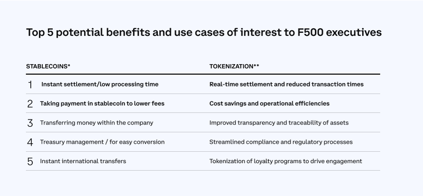 Rapporten noterade att sju av 10 Fortune 500-chefer är ivriga att utforska stablecoin-applikationer, särskilt för betalningar. Detta beror på deras omedelbara handläggningstider och lägre avgifter. Jose Fernandez da Ponte, SVP och General Manager för Blockchain, Crypto, and Digital Currencies på PayPal, erkände också betydelsen av stablecoins.