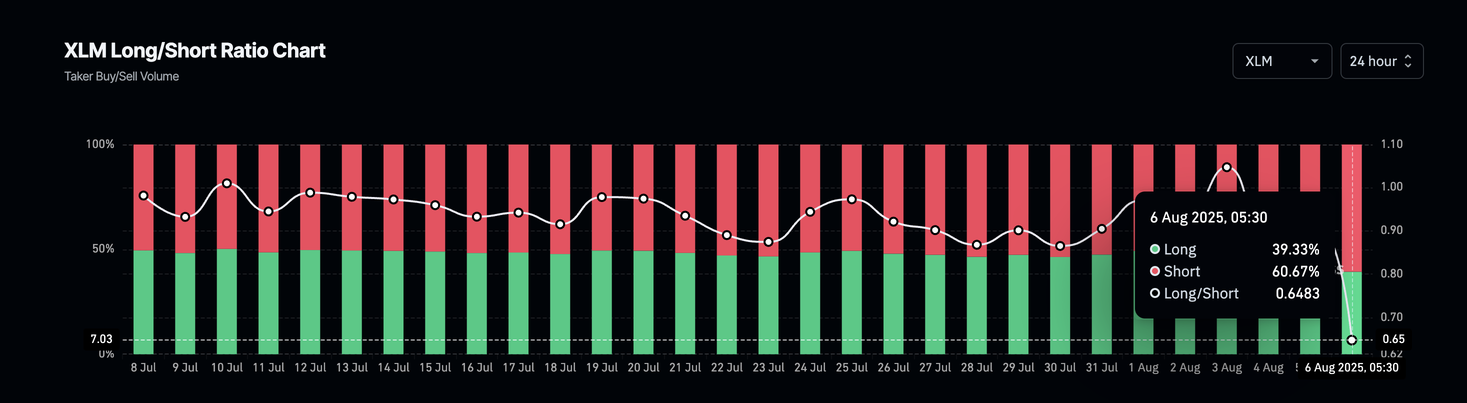 Lång-kort-förhållandet visar hur många handlare som satsar på att priset går upp (lång) jämfört med ner (kort). Ett högt kortförhållande betyder att majoriteten förväntar sig en XLM-prisnedgång.