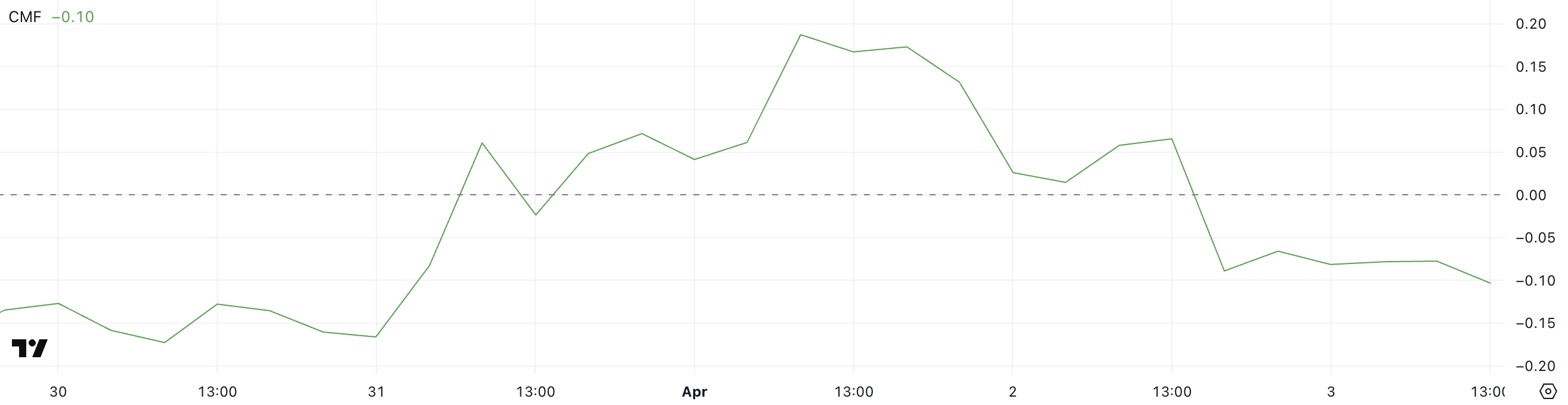 Stellars Chaikin Money Flow (CMF) har sjunkit till -10, en kraftig nedgång från 0,19 för bara två dagar sedan, vilket signalerar en betydande förändring i kapitalflödesdynamiken.