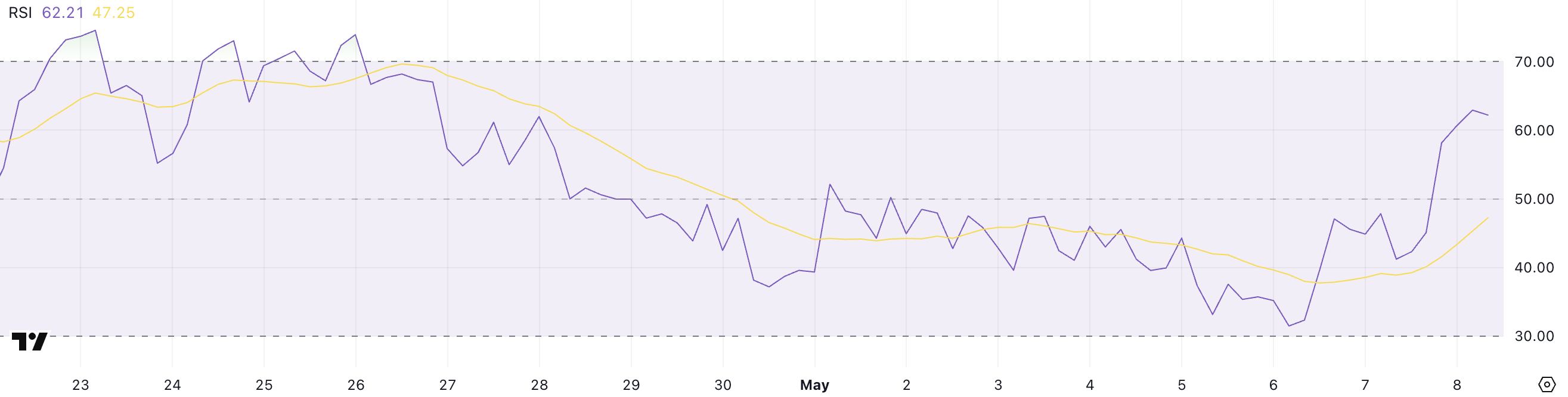 Stellar har sett sitt Relative Strength Index (RSI) hoppa kraftigt till 62,21, upp från 31,47 bara två dagar sedan.