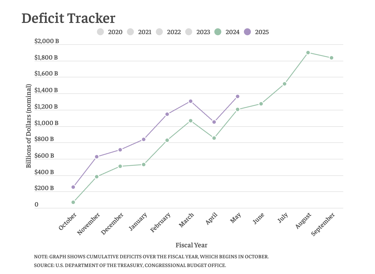 Enligt Bipartisan Policy Center nådde den federala statens budgetunderskott 1,1 biljoner USD i april 2025, en ökning med 13 % från förra året.