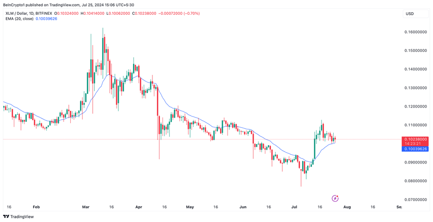 För att bekräfta nedgången i köptrycket handlas XLM för närvarande till sitt 20-dagars exponentiella glidande medelvärde (EMA), som spårar en tillgångs genomsnittliga pris under de senaste 20 handelsdagarna.