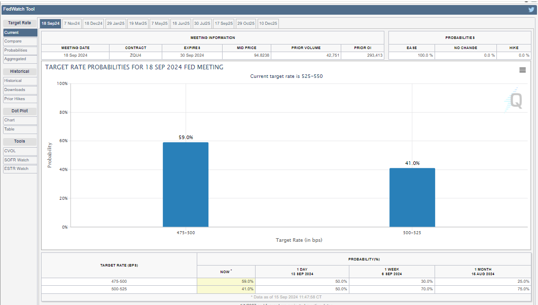 Storleken på sänkningen är dock oklar, och marknadsdeltagarna är ivriga att få reda på Federal Reserves föredragna strategi. Enligt CME FedWatch Tool finns det en 59% sannolikhet för en sänkning med 50 punkter och en 49% chans för en sänkning med 25 punkter.