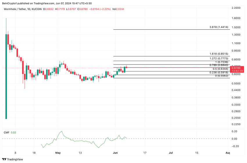 W:s CMF spårar hur pengar flödar in och ut ur marknaden. Med ett CMF-värde över noll ser W-marknaden mer likviditetsinflöde än kapitalutflöden. Denna hausseartade signal tolkas som ett tecken på att altcoin kommer att fortsätta sin uppåtgående trend.
