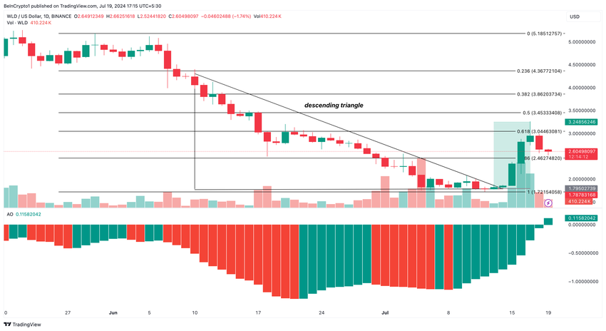 Vid ett tillfälle var Worldcoins pris 3,28 dollar. Före uppgången hade token bildat en fallande triangel på det dagliga diagrammet.