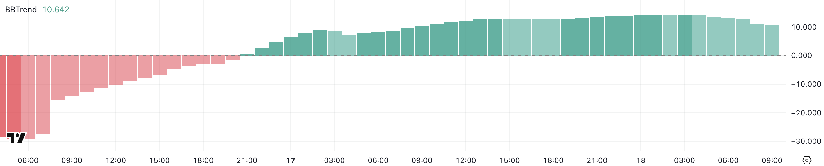 BBTrend (Bollinger Band Trend) är en indikator som mäter prisriktning i förhållande till dess Bollinger Bands, vilket hjälper till att identifiera trendstyrka och potentiella vändningar.