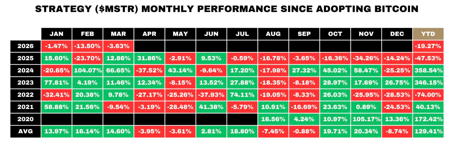 Tidigare år såg utvecklingen helt annorlunda ut. MSTR steg 358,54 % under 2024 och 346,15 % under 2023, när bitcoinpriset ökade kraftigt.