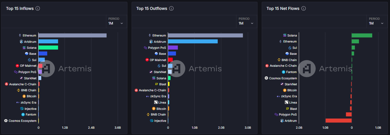 Mer data visar lovande signaler för SUI:s fortsatta attraktion för investerare under årets sista kvartal. Artemis data, som spårar kapitalflöden in och ut ur olika ekosystem, visar att SUI rankas som nummer tre i altcoin-nettoflöde under den senaste månaden, endast efter Ethereum och Solana.