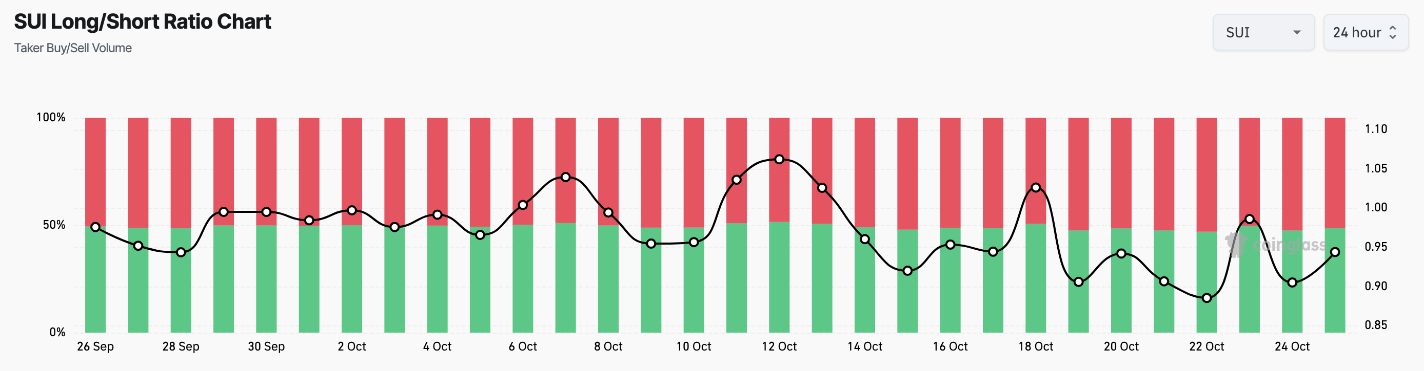 Enligt denna synvinkel visar data från Coinglass att förhållandet mellan långa och korta positioner under 24 timmar för närvarande är under 1. Detta förhållande fungerar som en indikator på investerarsentiment; när det överstiger 1, indikerar det fler långa positioner—de som satsar på en prisökning—än korta.