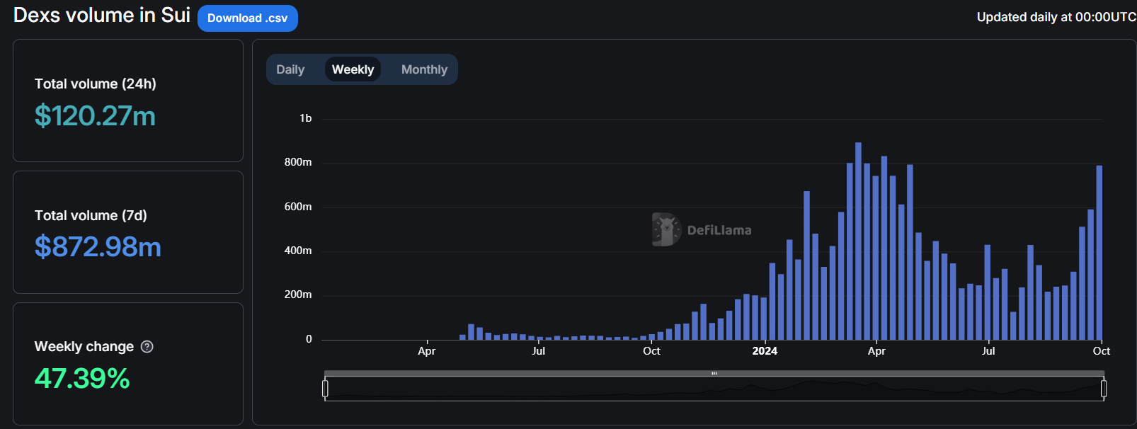 Suis DeFi-ekosystem expanderar också, med ökande transaktionsvolymer och ett växande antal decentraliserade applikationer (dApps). Data från DefiLlama avslöjar en 40%-ig ökning av Suis decentraliserade börstransaktionsvolym, som nådde 872 miljoner USD i veckotransaktioner.