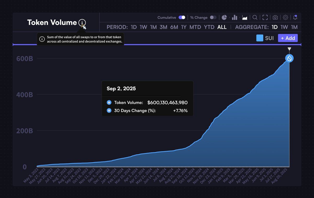 Låga och stabila avgifter förbättrar slutanvändarens upplevelse och möjliggör användningsområden med hög genomströmning som spel, DeFi eller mikropayments. Sui:s totala tokenvolym har nått 600 miljarder USD, vilket markerar en ökning på +7,76 % de senaste 30 dagarna.