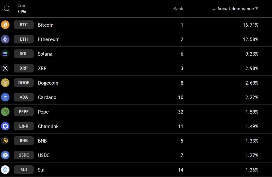 Marknadssentiment och varumärkessynlighet visar också positiva signaler. Data indikerar att SUI:s “sociala dominans” (ett mått på diskussionsfrekvens) fortsätter att öka och nu närmar sig topp 10.
