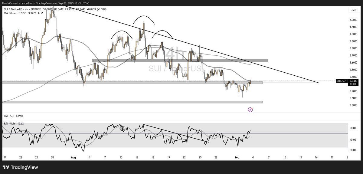 Enligt BeInCrypto Market handlas SUI för närvarande runt 3,3–3,4 USD, fortfarande 37 % under sitt all-time high i januari 2025 på 5,35 USD.