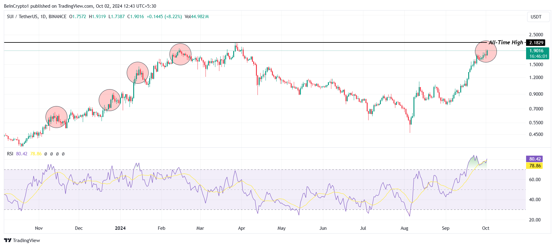 SUI såg en ökning på 8% i pris under de senaste 24 timmarna, vilket förde det till 1,90 USD. Nästa motstånd för altcoinen är 2,18 USD, vilket ligger 15% från det nuvarande priset. Med tanke på det nuvarande momentet verkar SUI redo att uppnå detta på kort sikt, vilket skulle förlänga den pågående uppgången på 151% från september.