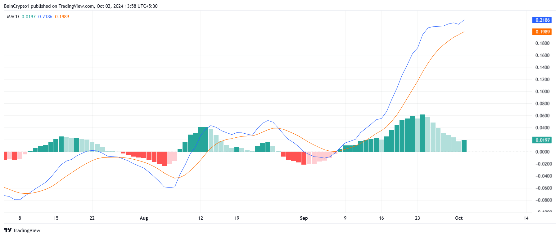De stigande gröna staplarna på histogrammet indikerar ett stärkt positivt momentum, vilket tyder på att köpare tar kontroll. Denna förändring pekar på en möjlig fortsättning av den nuvarande uppåtgående trenden, med SUI:s pris redo att få mer dragkraft i kommande sessioner.