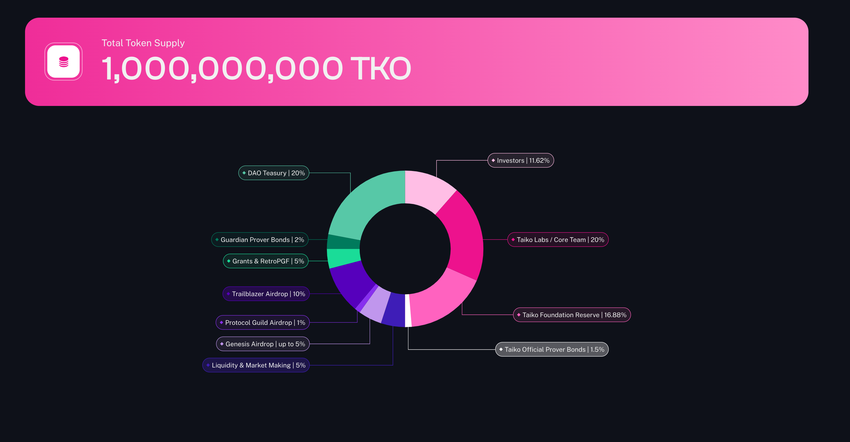 Den totala tokenförsörjningen fördelas noggrant. Nyckelintressenter får 48,5%, med 20% som går till Taiko Labs och kärnteamet, 16,88% till Taiko Foundation-reserver och 11,62% till investerare. DAO Treasury innehar 20% av tokens. Teamet avsatte också 5% för bidrag och RetroPGF, ytterligare 5% för likviditet och market making, och 10% för Trailblazer airdrop, som skiljer sig från genesis airdrop.