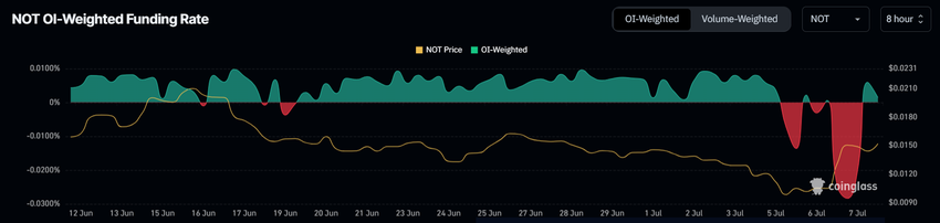 Förutom det positiva RSI har Notcoins finansieringsränta också blivit positiv. Detta skifte är betydande, särskilt efter en period med intensivt negativa finansieringsräntor, som tidigare hade signalerat ett baisseartat sentiment.