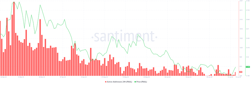 PAAL:s pris har stigit med en tvåsiffrig procentsats under det senaste dygnet. När priset börjar återhämta sig fortsätter PAAL AI aktiva adresser att sjunka, vilket inte är ett hausseartat tecken för prisåtgärder.