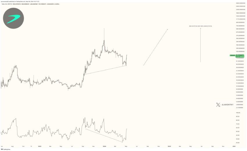 “TRB (Tellor) börjar nu visa stor styrka efter att ha etablerat ett hausseartat mönster och kan fortfarande vara på väg att förbereda sig för en massiv ökning, potentiellt över 315%, som kan leda priset tillbaka till över 261 dollar”, kommenterade Marks.