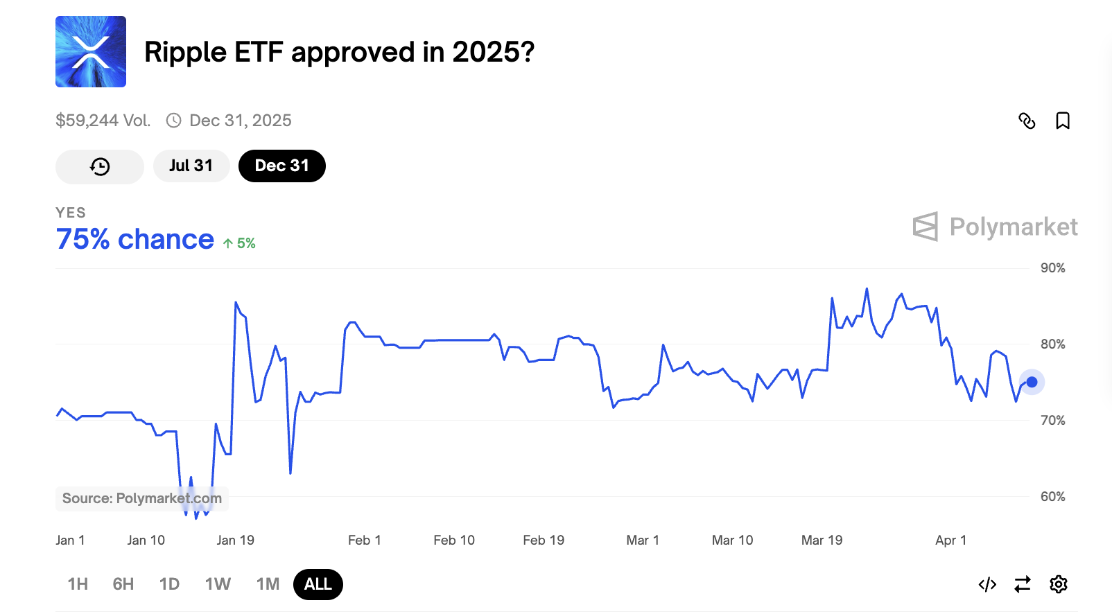 Sannolikheten för godkännande före december 2025 är nu 75%. Däremot är utsikterna för ett kortsiktigt godkännande före den 31 juli mer försiktiga, med odds som för närvarande ligger på bara 33%.
