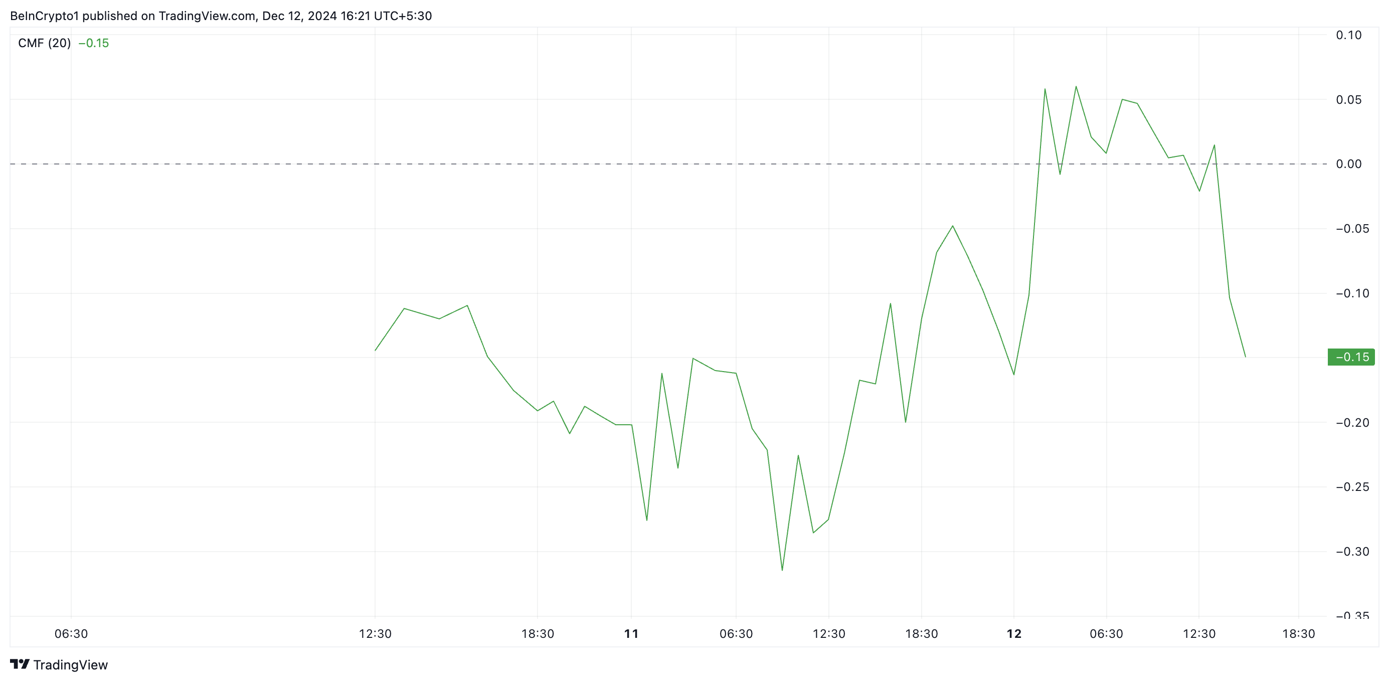 CMF-indikatorn spårar penningflöden in och ut ur marknaden. Ett negativt CMF-värde signalerar ökat säljtryck och antyder en fortsatt prisnedgång.