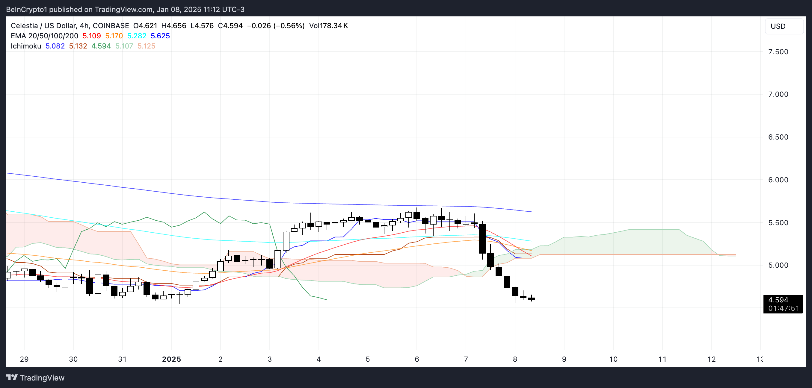 Ichimoku Cloud visar en nedåtgående trend för Celestia