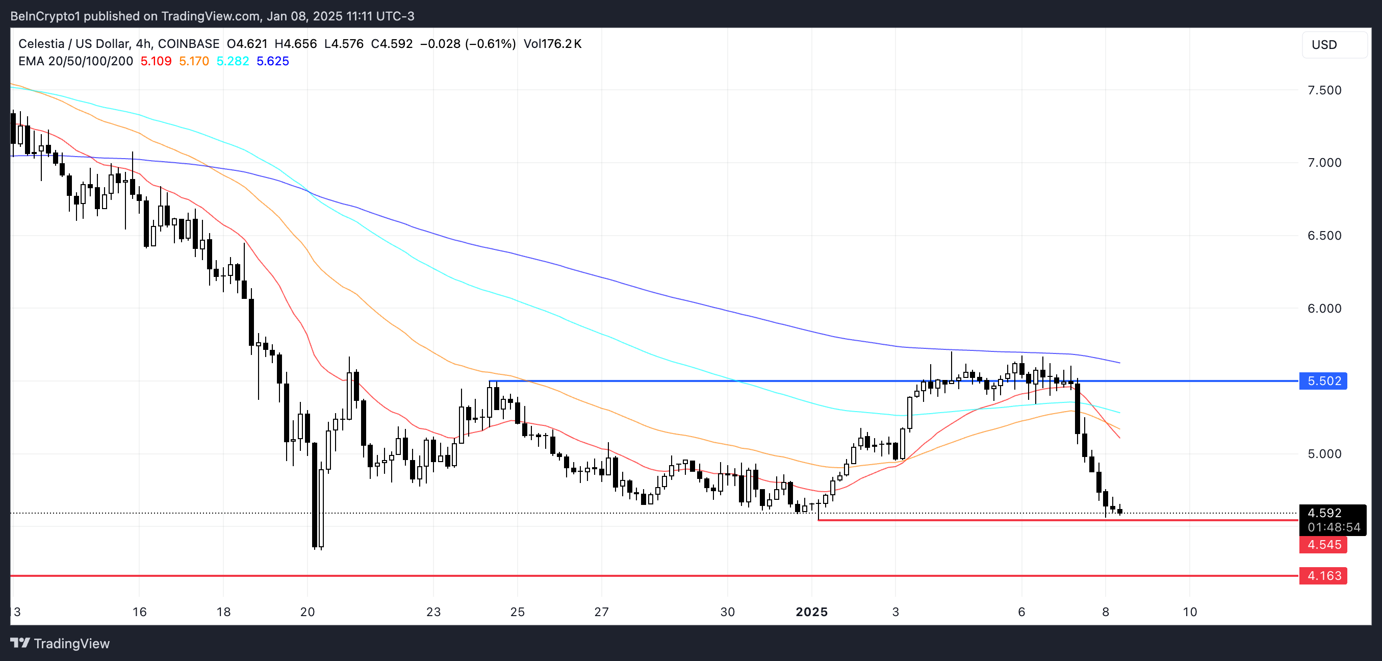 Den senaste bildningen av ett dödskors för Celestia har intensifierat dess negativa momentum, vilket orsakar fler prisnedgångar. Ett dödskors inträffar när ett kortsiktigt glidande medelvärde korsar under ett långsiktigt glidande medelvärde, vilket signalerar en potentiell övergång till en mer långvarig nedåtgående trend.