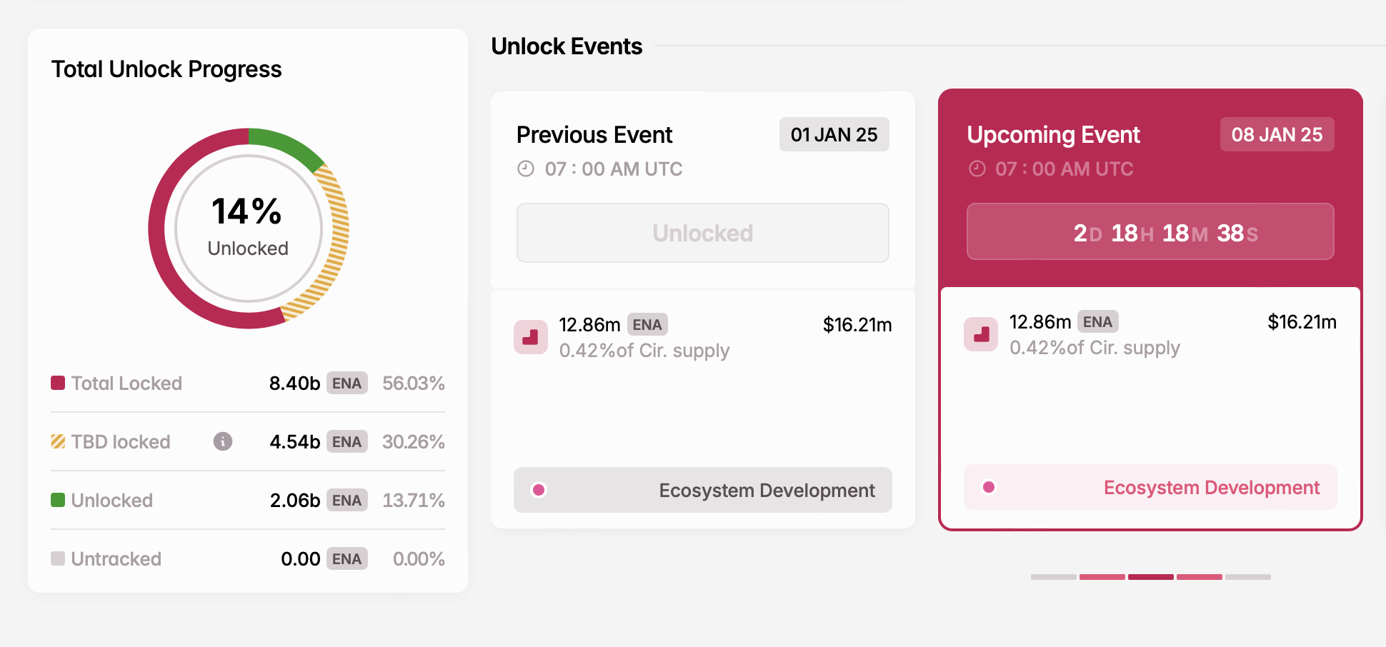 ENA, protokollets inhemska token, låter innehavare delta i styrning. Den 8 januari kommer Ethena att låsa upp mer än 12 miljoner ENA-tokens, värda 16,21 miljoner USD, avsedda för ekosystemutveckling.