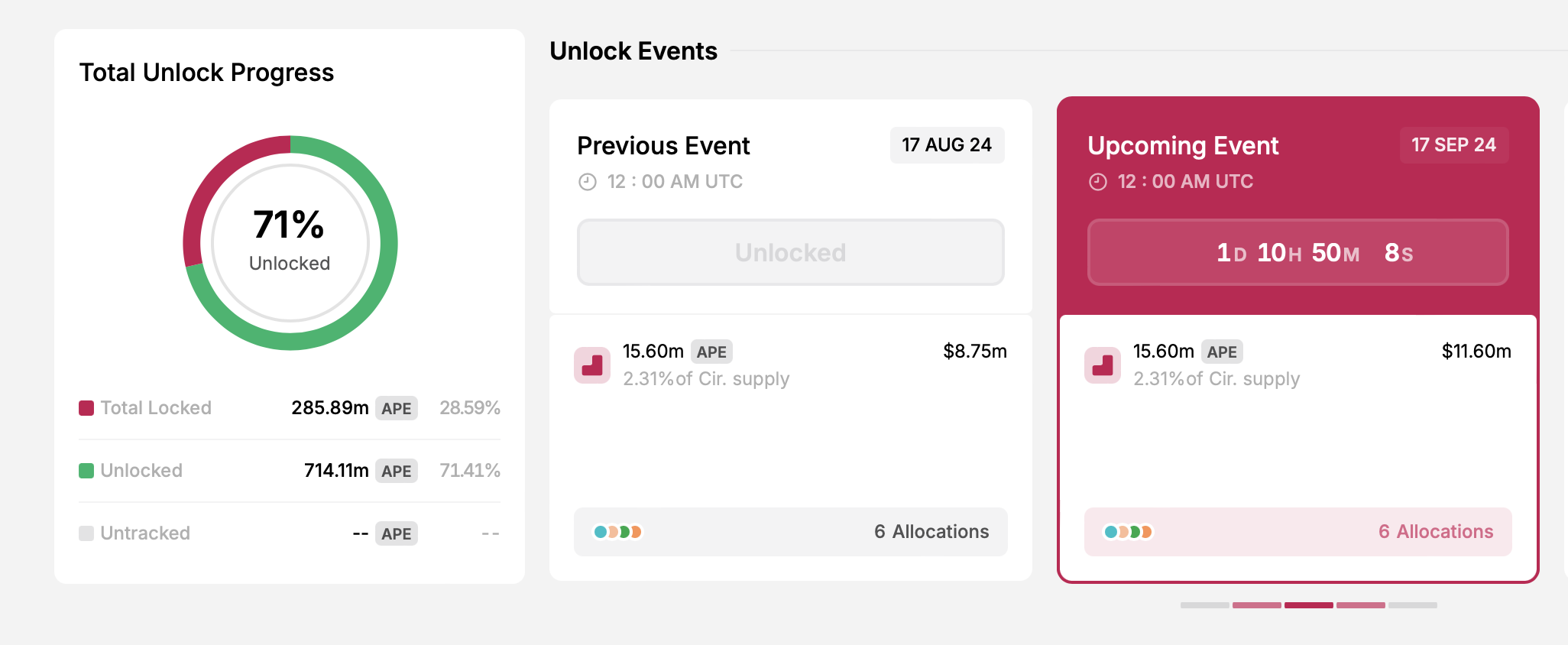 Vanligtvis upplever APE ett prisfall efter stora upplåsningar. Investerare och handlare bör vara uppmärksamma på detta evenemang, eftersom det kan påverka tokenens dynamik avsevärt.