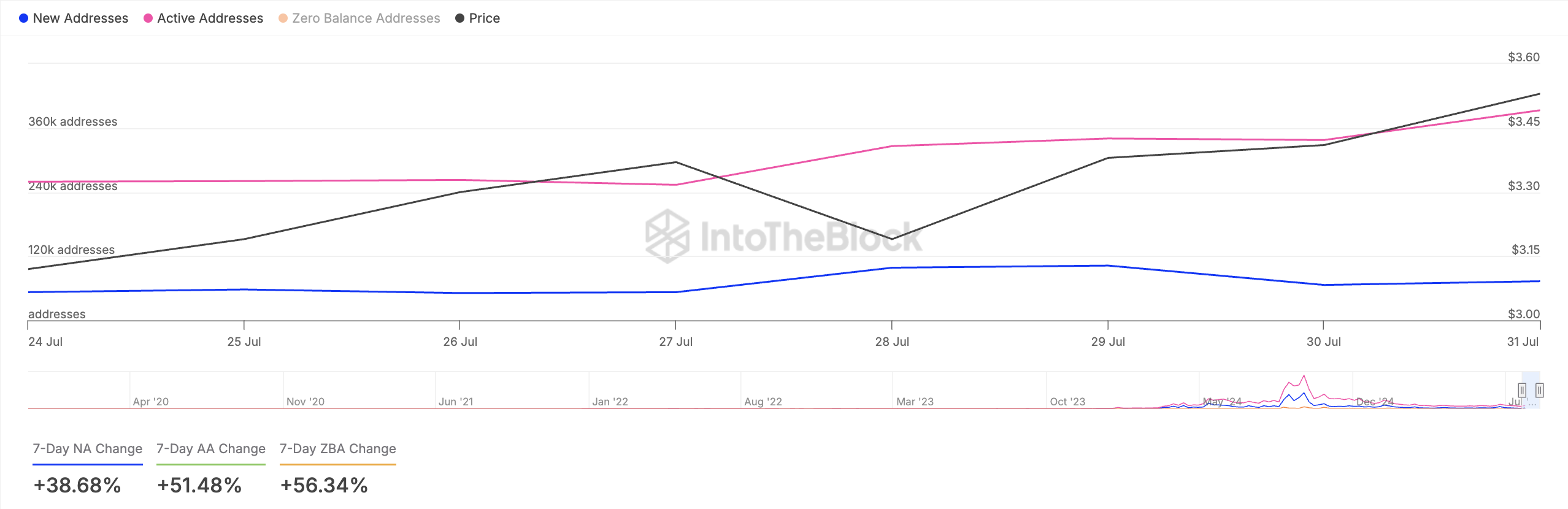 Enligt IntoTheBlock har den nya efterfrågan på TON ökat med 38 % under de senaste sju dagarna, vilket återspeglar stödet bakom dess nuvarande uppåtgående trend. Ökningen i ny efterfrågan indikerar nytt kapital som kommer in i ekosystemet, ofta från förstagångsanvändare eller investerare.