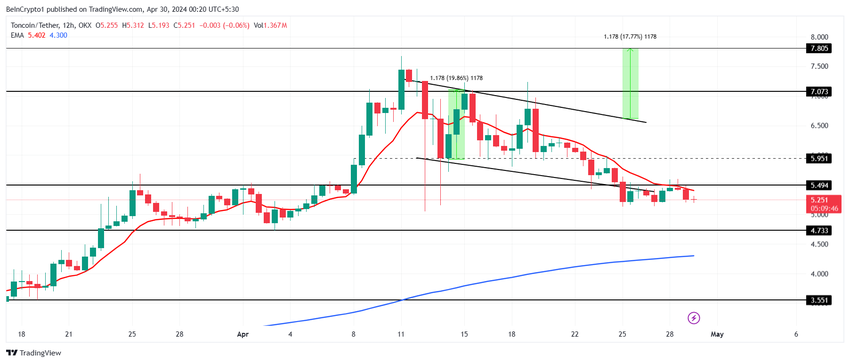 Toncoins pris förväntades notera ett rally förra veckan, men efter att ha fallit ur den fallande kanalen förändrades priset. TON föll men höll sig flytande på cirka $ 5.2 och $ 5.4, vilket markerar motståndsnivån.