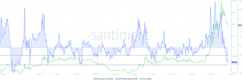 MVRV-förhållandet övervakar investerarnas vinster och förluster. Med Toncoins 30-dagars MVRV på -13.22%, vilket indikerar förluster, kan återhämtning följa. Historiskt sett, när TON genomgår en -10% till -20% MVRV-zon, är det känt som en ackumuleringsmöjlighetszon.