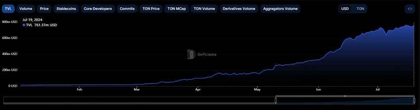 Denna utveckling verkar ha ökat TON:s pris. På mindre än 24 timmar har TON:s pris stigit med cirka 2,67%, från $7,21 till $7,31. TON uppnådde också ett nytt rekordhögt totalt värde låst (TVL). Enligt uppgifter från DefiLlama är TON:s TVL 761,37 miljoner dollar i skrivande stund.