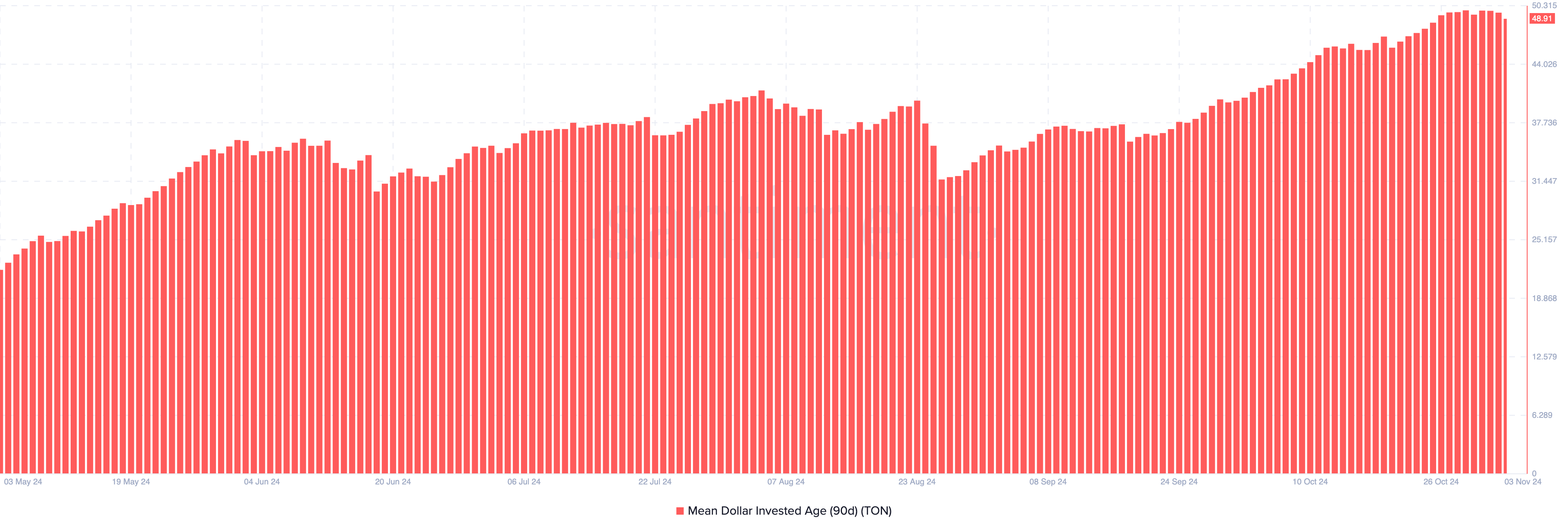 Dessutom verkar det finnas en stark grund för handlarnas positioner. On-chain-data från Santiment visar en betydande ökning av Mean Dollar Invested Age (MDIA) — den genomsnittliga åldern på alla tokens på en blockchain, viktad efter köppris.