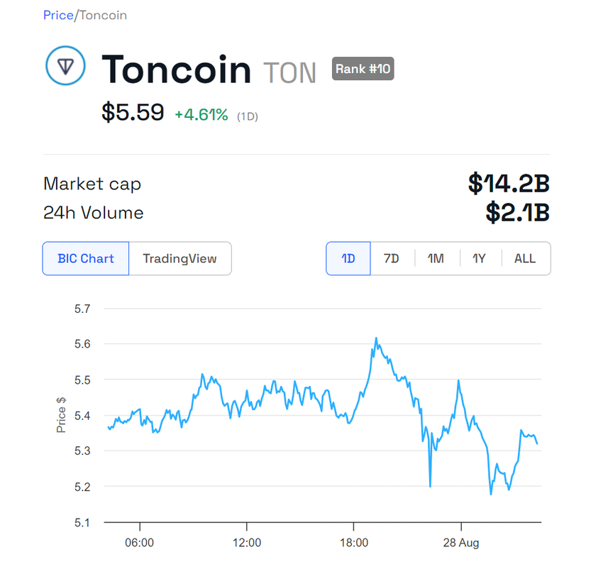 Nyheten om Pavel Durovs frigivning påverkade omedelbart Toncoin, den infödda token för The Open Network (TON) blockkedjan, som har en nära koppling till Telegram. Strax efter rapporten om frigivningen steg Toncoins pris från 5,31 USD till 5,75 USD, vilket markerar en ökning på 8,3% på bara 20 minuter.