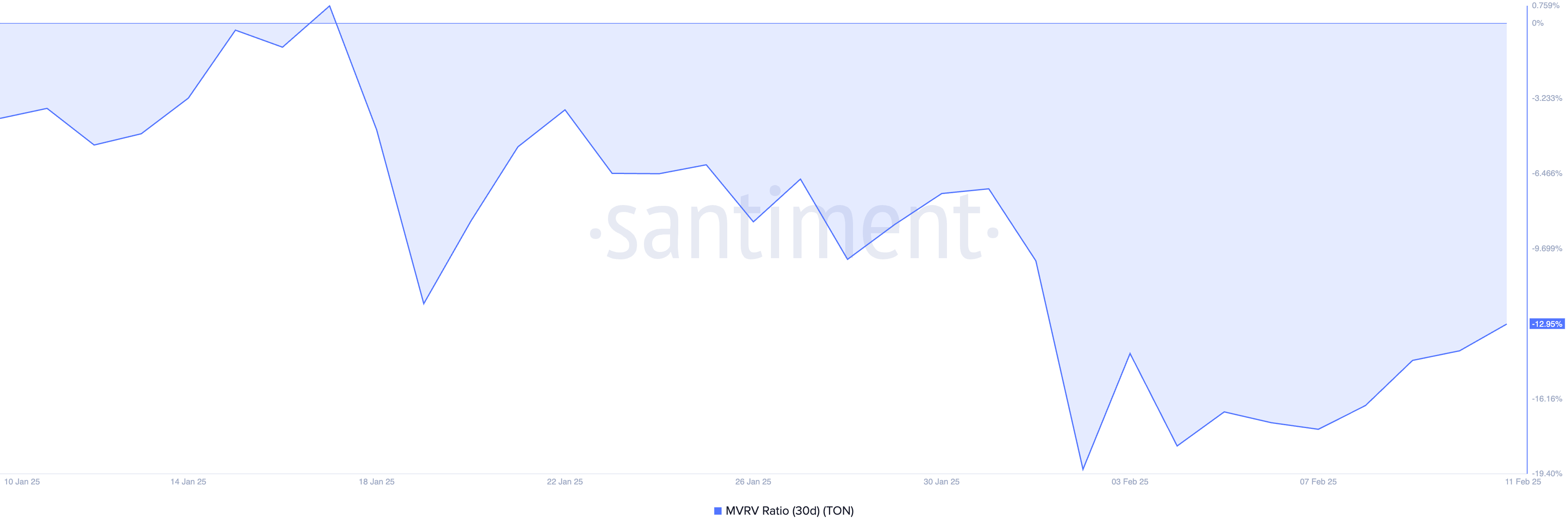 Å andra sidan, som med TON, när förhållandet är negativt, är tillgångens marknadsvärde lägre än dess realiserade värde. Detta tyder på att myntet är undervärderat jämfört med vad folk ursprungligen betalade för det. Historiskt sett presenterar negativa förhållanden som detta en köpmöjlighet för dem som vill “köpa dippen” och “sälja högt”.