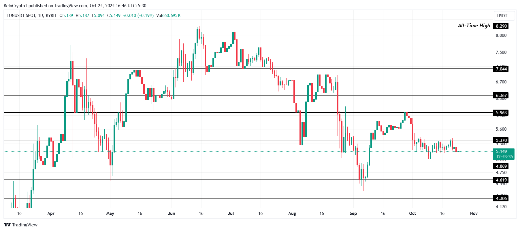 Trots det negativa sentimentet håller sig Toncoins pris över stödnivån på 4,86 USD. Detta tyder på att även om det saknas uppåtgående momentum, är det troligt att Toncoin kommer att förbli konsoliderad inom detta intervall, över 4,86 USD men under 5,37 USD.