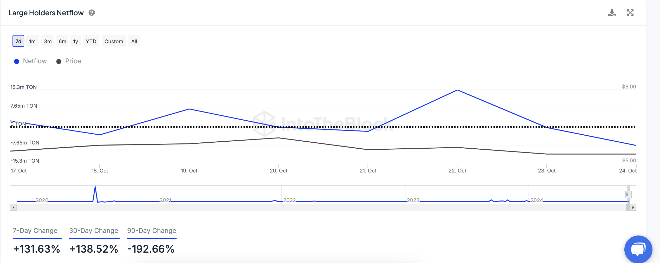 Stora innehavare eller valar av Toncoin har varit aktiva de senaste veckorna. Ökningen i nätflödet för altcoinens stora innehavare signalerar att de har ackumulerat TON-tokens. Under de senaste sju dagarna har detta ökat med 131,63%.