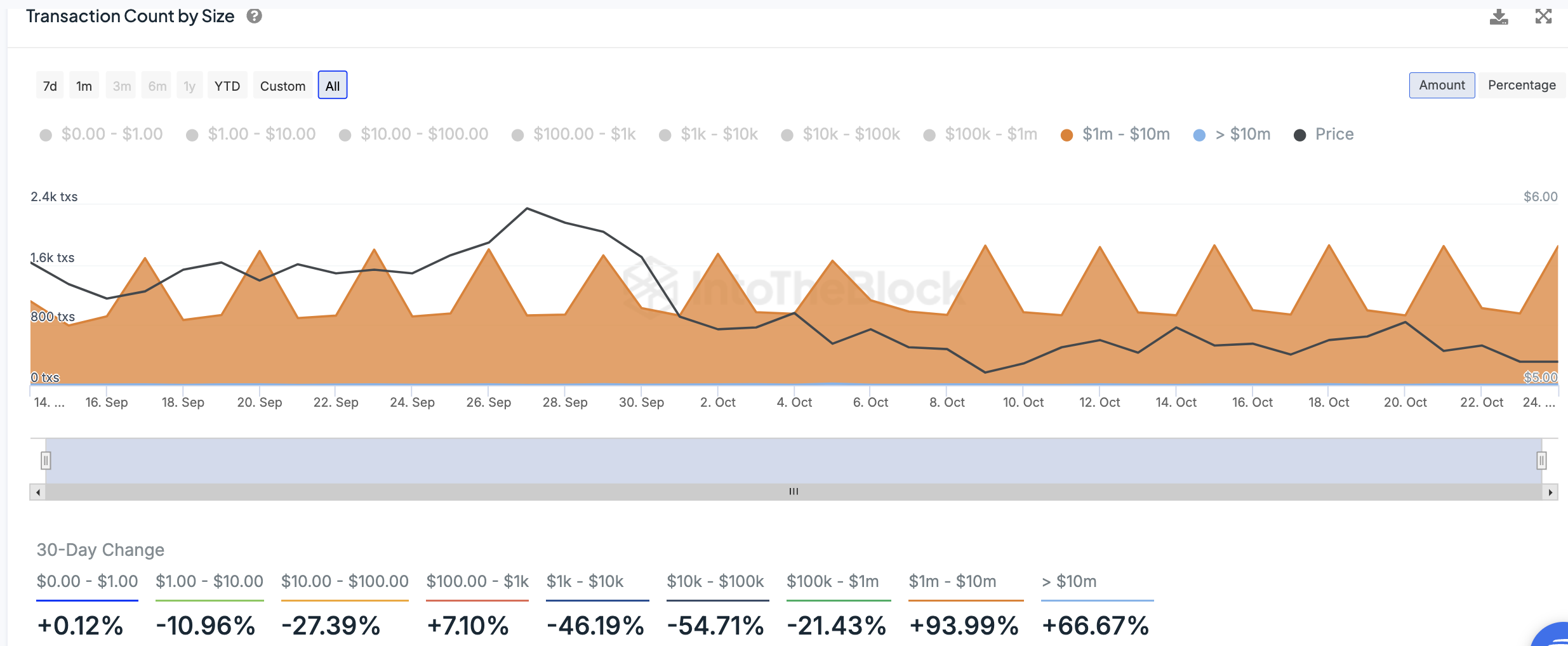 Dessutom har den dagliga mängden stora transaktioner som involverar Toncoin skjutit i höjden under den senaste månaden. Enligt data från IntoTheBlock har antalet dagliga TON-transaktioner värda mellan 1 miljon USD och 10 miljoner USD ökat med nästan 94% under de senaste 30 dagarna. Under samma period har den dagliga mängden större transaktioner värda över 10 miljoner USD stigit med nästan 67%.