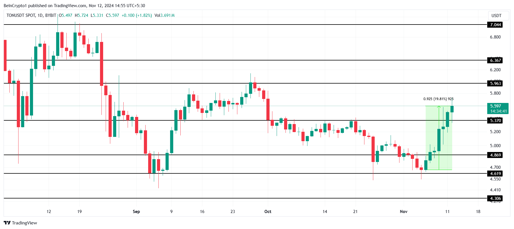 Toncoin har ökat nästan 20% under den senaste veckan, och handlas runt 5,59 USD. TON siktar nu på det kritiska motståndsnivån på 5,96 USD när den försöker bryta igenom och nå 6,00 USD, en betydande milstolpe för tillgången.