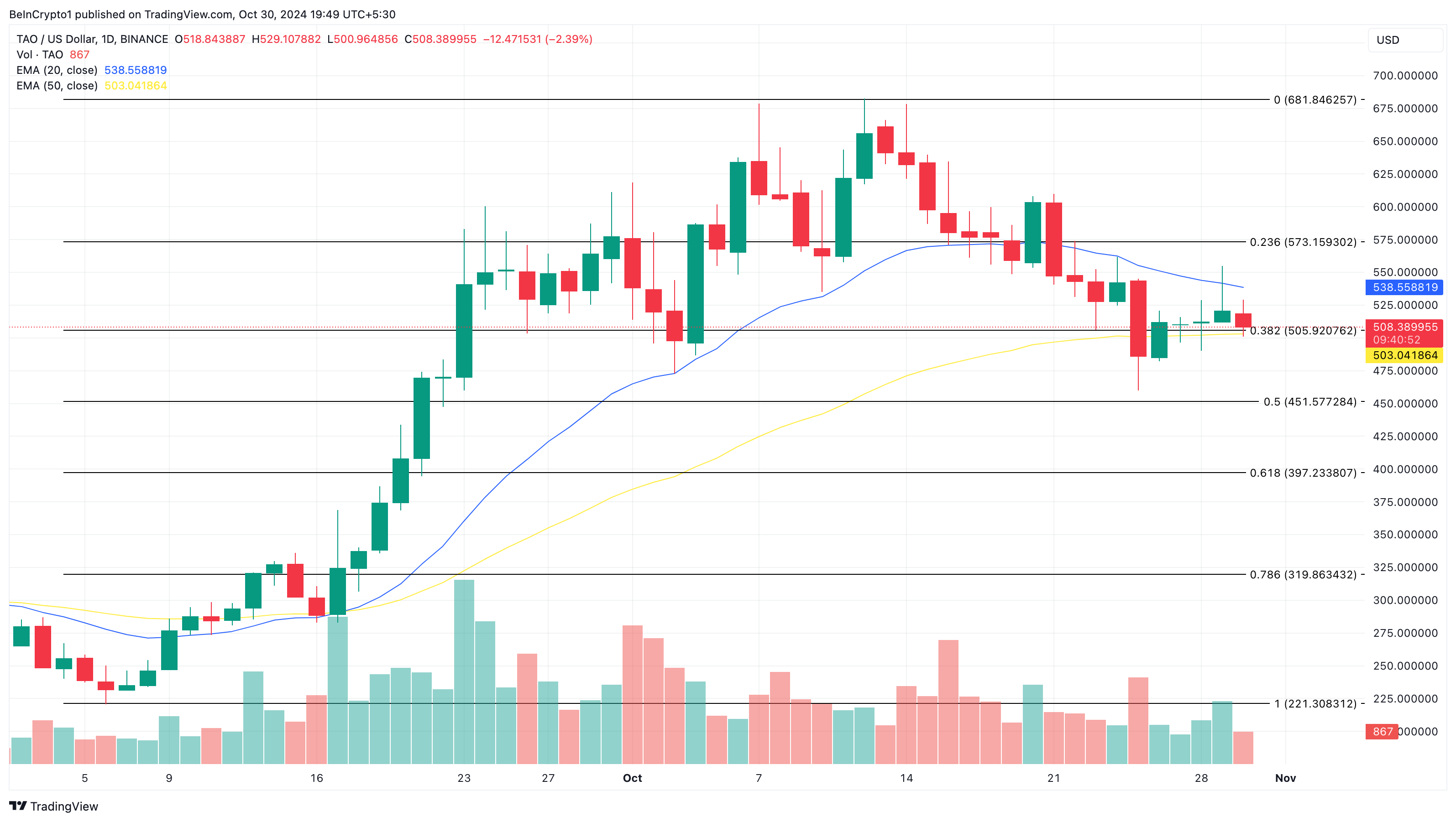 På den dagliga grafen ligger TAO:s pris under det 20-dagars exponentiella glidande medelvärdet (EMA), i blått. Dock har samma token ännu inte fallit under 50 EMA (gult). Allt tyder på att det är osannolikt att den kommer att falla under denna tröskel, vilket indikerar att TAO:s pris kan hoppa mot 681,85 USD i november.