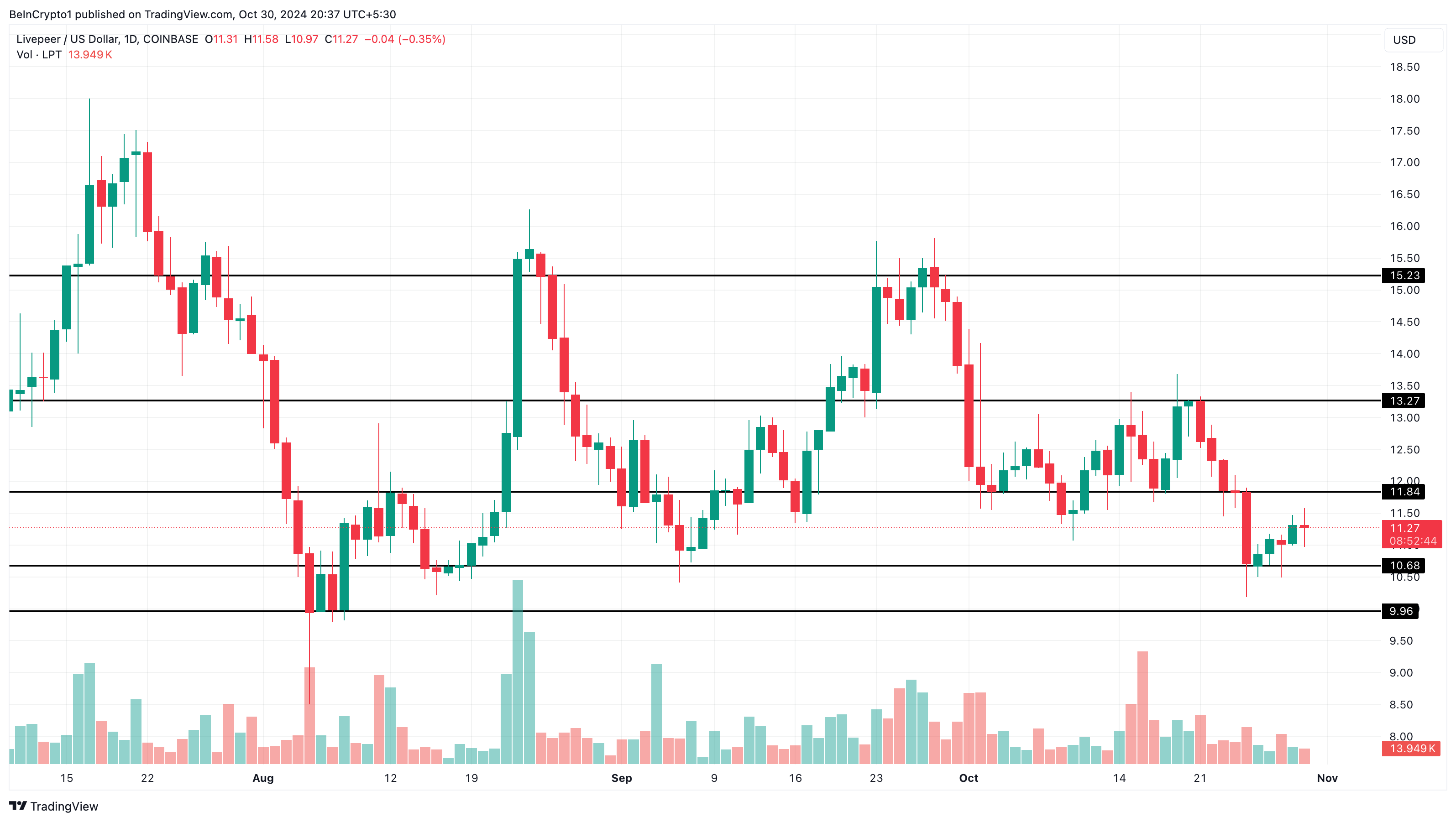 Med denna ökning är det troligt att altcoinens värde kommer att fortsätta stiga in i november. Utan hinder kan LPT:s pris bryta motståndet vid 11,84 USD och stiga mot 13,27 USD. I ett mycket optimistiskt scenario kan altcoinen hoppa till 15,23 USD.