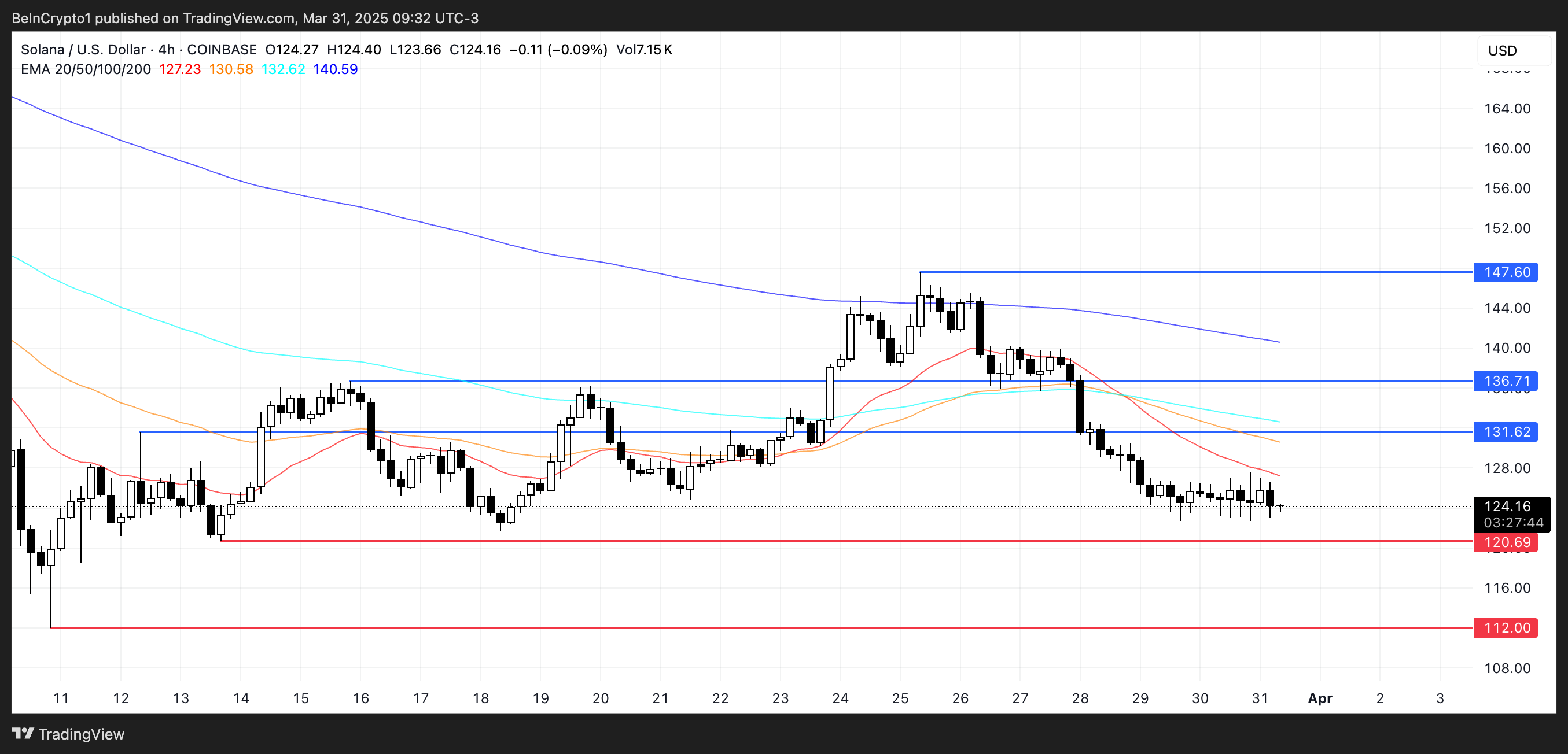 Ett genombrott under den nivån kan se SOL sjunka ytterligare mot 112 USD.