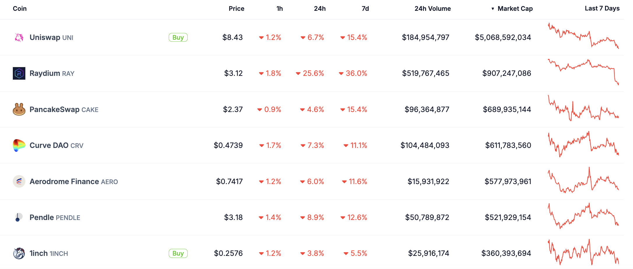 AMMs-mynt har haft en tuff vecka, med alla sju främsta mynten i rött. Automatiserade marknadsgörare är decentraliserade börser som låter användare handla digitala tillgångar utan att använda en traditionell orderbok.