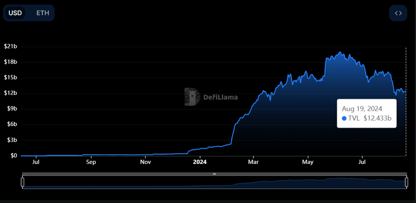 Denna expansion markerar ytterligare en milstolpe för EigenLayer, som fortsätter att dominera DeFi-marknaden. Vid tidpunkten för skrivandet visar data från DefiLlama att EigenLayer är det näst största DeFi-protokollet, med ett totalt låst värde på cirka 12,4 miljarder USD.