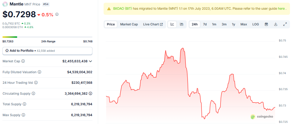 Data på CoinGecko visar att Mantle Network-tokens pris har sjunkit med 0,5 % de senaste 24 timmarna. Vid skrivande stund handlades MNT för 0,7298 USD.
