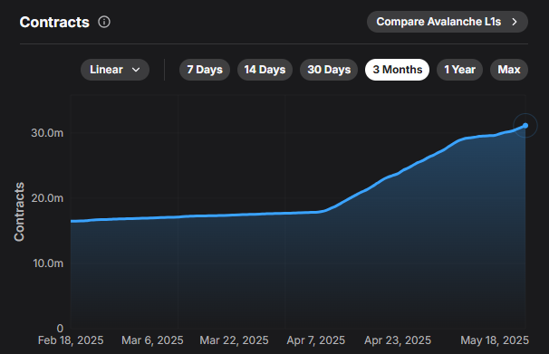 Samtidigt, enligt Avalanche Foundation, har mer än 30 miljoner kontrakt implementerats över alla indexerade Avalanche Layer-1 (L1) nätverk. Ungefär 10 miljoner implementerades bara den senaste månaden, med ökande aktivitet över Avalanche-nätverket.