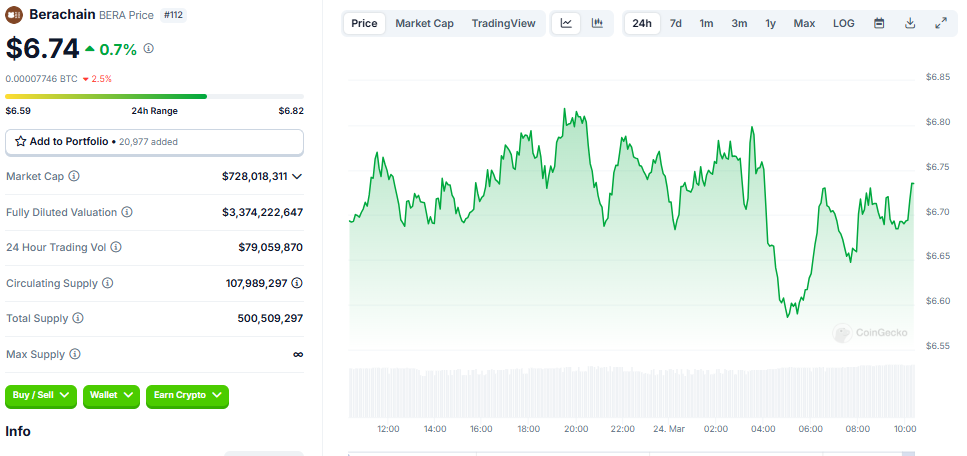 Data på CoinGecko visar att BERA handlades för 6,74 USD vid denna tidpunkt, upp endast med blygsamma 0,7 % de senaste 24 timmarna.