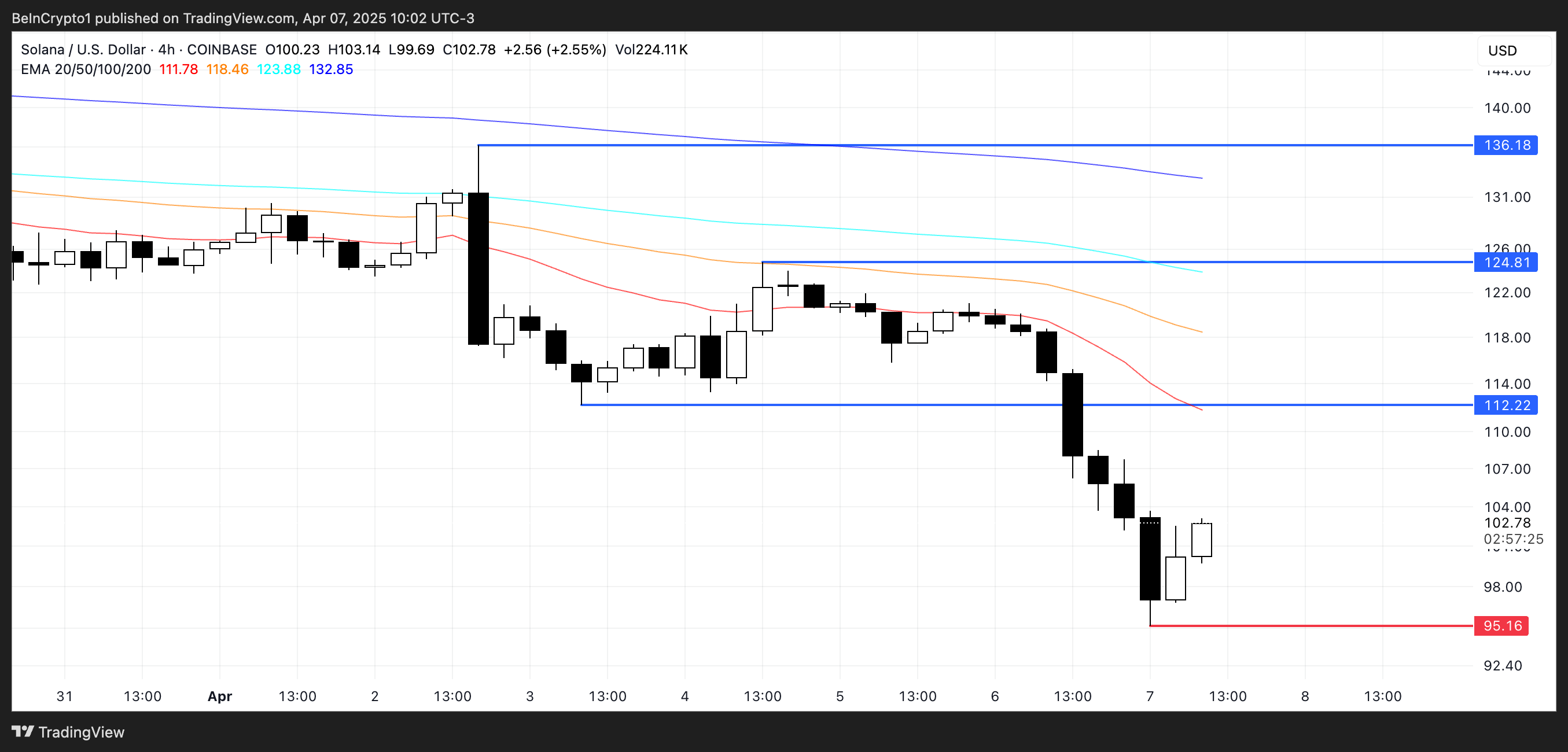 Om den negativa trenden fortsätter kan SOL testa stödnivån vid 95 USD, och ett brott under den kan leda till ytterligare nedgång mot 90 USD.