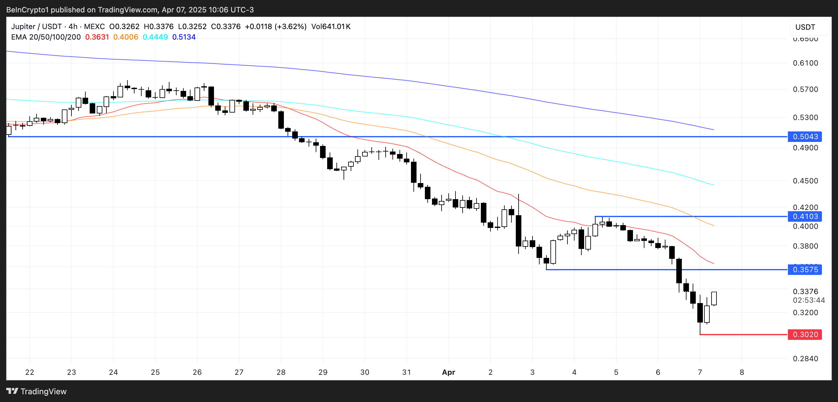Om nedgången fortsätter kan Jupiter falla under 0,30 USD, vilket sätter nya bottennivåer; men om det återfår positiv trend kan token stiga till 0,35 USD, 0,41 USD och potentiellt testa 0,50 USD-nivån igen.